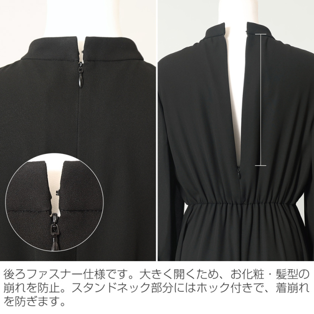 後ろファスナー対応デザイン。大きく開くため、髪型やお化粧の崩れ防止も。スタンドネック部分はホック付で、着崩れを防ぎます。