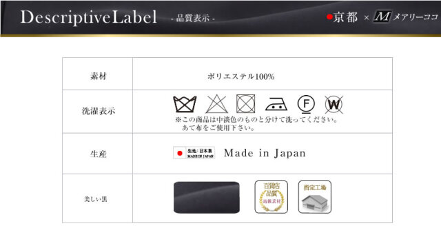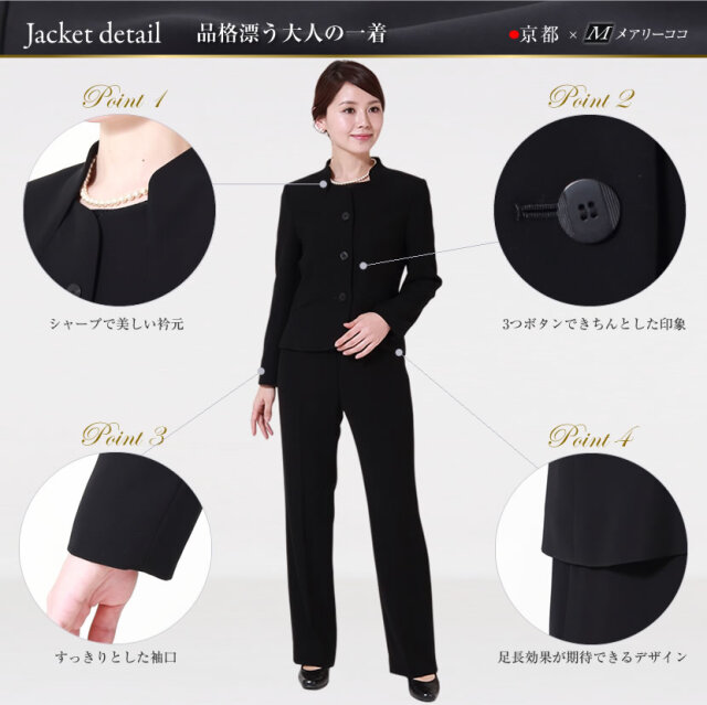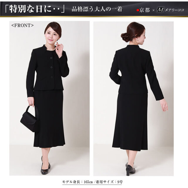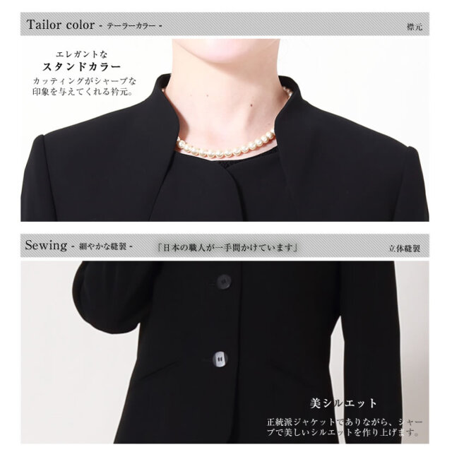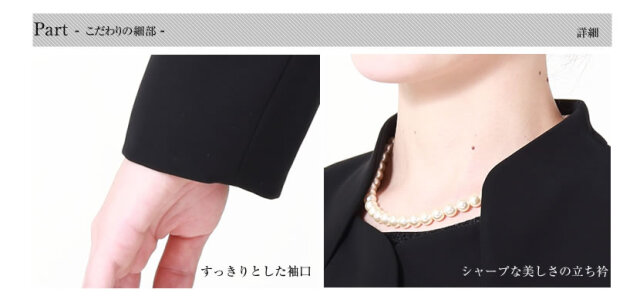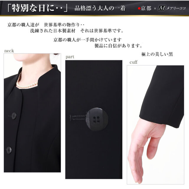 | 素材 | ブラックフォーマル専門店メアリーココで使用しているブラックフォーマル(喪服・礼服)の生地は丁寧に選ばれた美しい、ワンランク上の黒。周りに劣らない深い黒と自慢の立体縫製が奏でる美シルエットに自信があります。快適なストレッチ性を持ち、高級な深黒と抜群の手触りが魅力的。高級感のある佇まいを演出します。 |