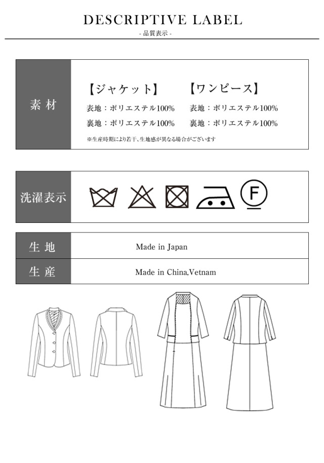 二枚着ているように見える一体型のワンピースは、ジャケットを脱いでも上品な佇まい。一枚で着てもサマになるデザインです。 年齢を問わず着る事が出来る、上品かつ上質なレディースフォーマルです。 |