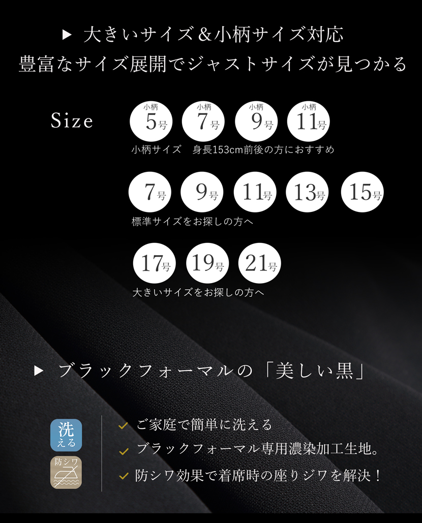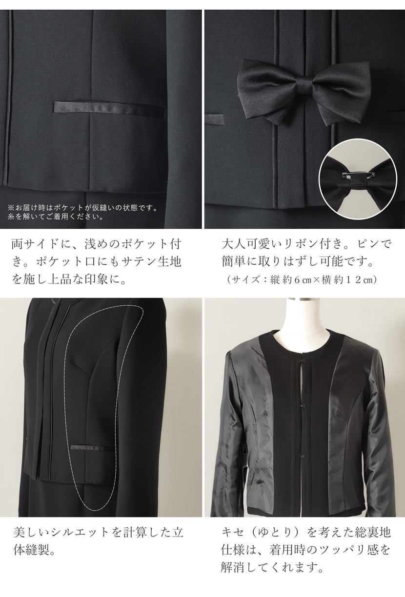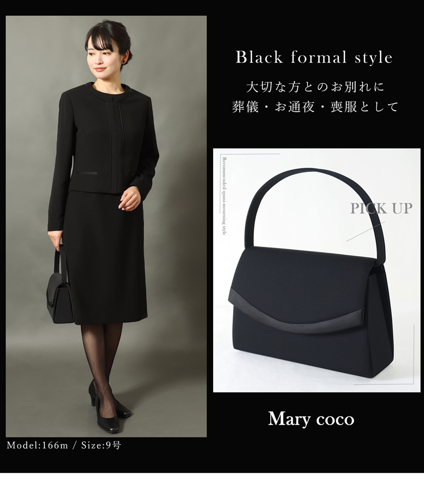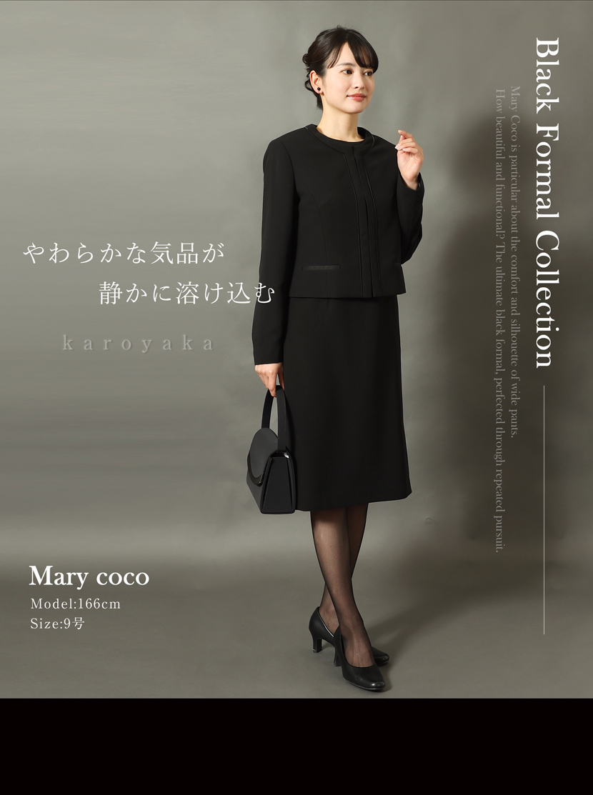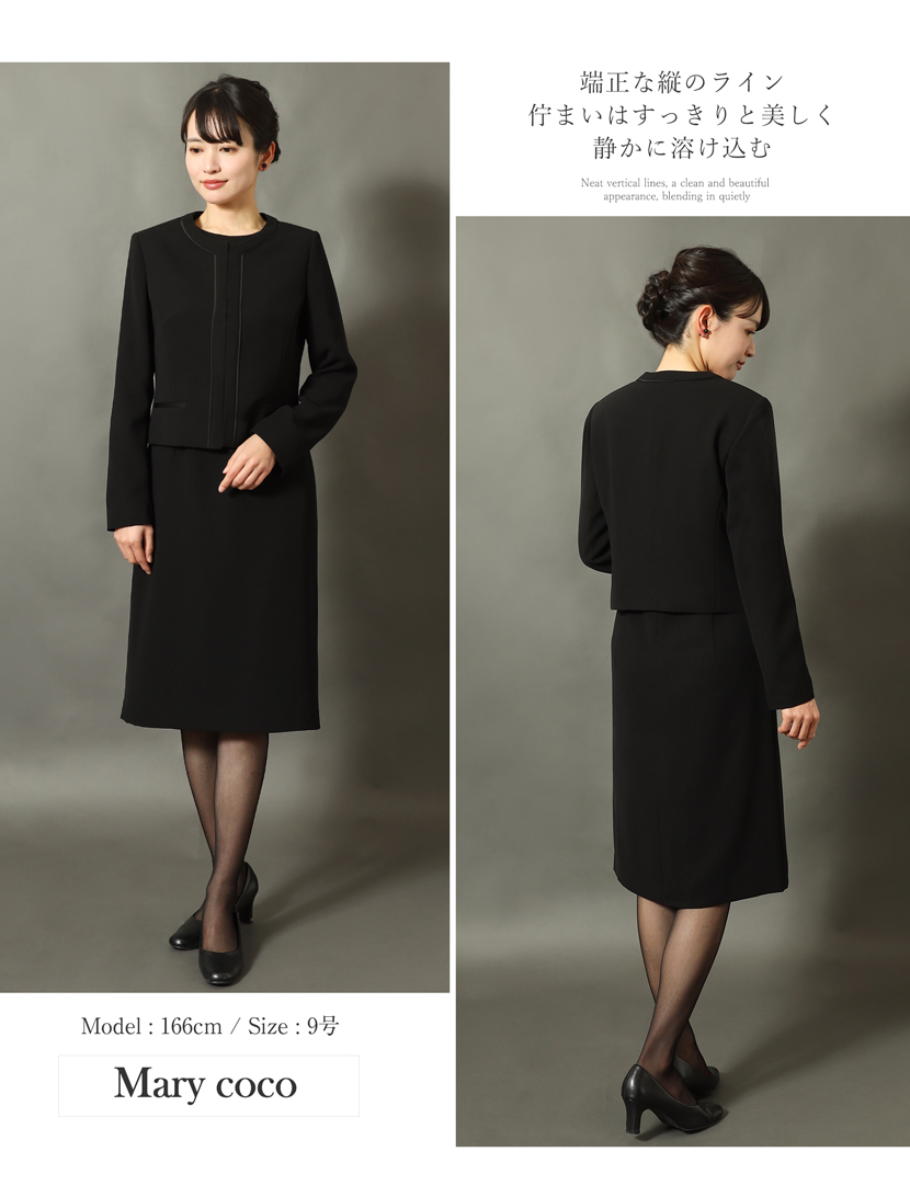 ブラックフォーマル専門店メアリーココで使用しているブラックフォーマル(喪服・礼服)の生地は丁寧に選ばれた美しい、ワンランク上の黒。周りに劣らない深い黒と自慢の立体縫製が奏でる美シルエットに自信があります。ご家庭で簡単に洗えるイージーケアが魅力的です。汗ばむ季節やちょっとにおいが気にあるときも簡単にお手入れ出来ます。ぜひ手に取り、品質をご確認ください。