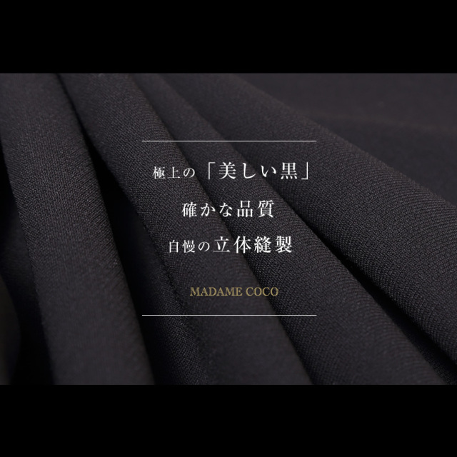 ブラックフォーマル専門店メアリーココで使用しているブラックフォーマル(喪服・礼服)の生地は丁寧に選ばれた美しい、ワンランク上の黒。周りに劣らない深い黒と自慢の立体縫製が奏でる美シルエットに自信があります。ご家庭で簡単にお洗濯できる、洗える生地です。汗ばむ季節や匂いが気になるときも簡単いに洗うことが出来て、いつも清潔にご着用頂けます。静電防止加工で生地のまとわり付も軽減する、機能性に優れた生地です。ぜひ手に取り、品質をご確認ください。