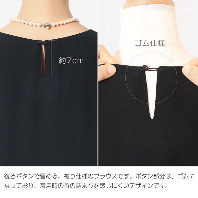 襟元にタックを施しております。後ろはボタンで留める仕様です。