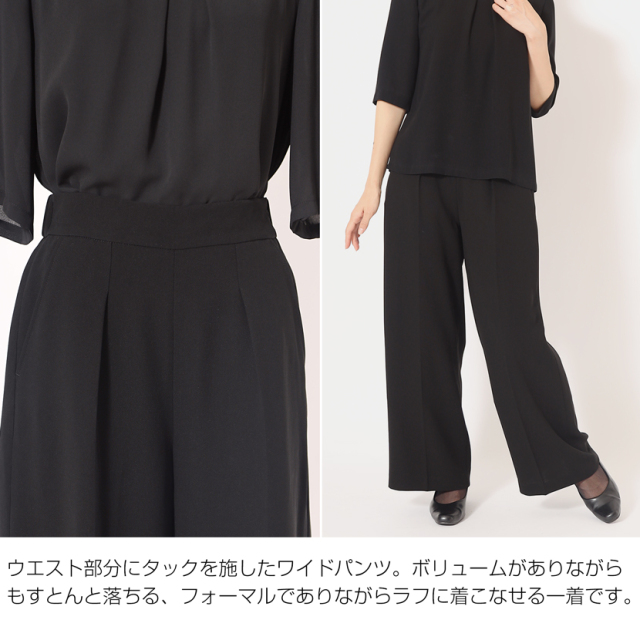 襟元にはタックを施し、優しい印象の黒ブラウスです。シンプルなデザインで着回し力抜群!ON/OFFどちらも着回せる優秀ブラウスです。