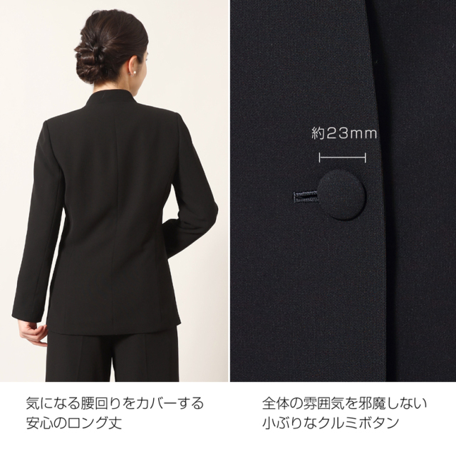 体型を拾わない、シンプルジャケット。縦のラインがかっこいい、エレガントな雰囲気を演出します。