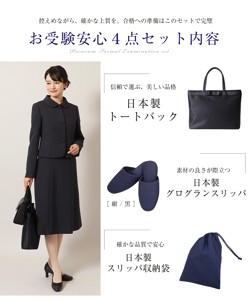 【 15%OFF】お受験安心4点セット お受験スーツ 濃紺スーツプレミアムフォーマルセット 濃紺選べるワンピース 家庭で洗えるトートバッグ 日本製スリッパ 日本製スリッパ収納袋の豪華4点セット pfkva-0526[nv]