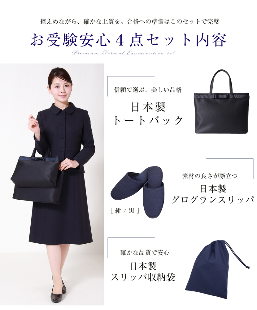 【15%OFF】お受験安心4点セット お受験スーツ 濃紺スーツプレミアムフォーマルセット濃紺アンサンブル(半袖)ウール混紡+日本製トートバッグ+日本製スリッパ+日本製スリッパ収納袋の豪華4点セット PFKVA-7116w[nv]