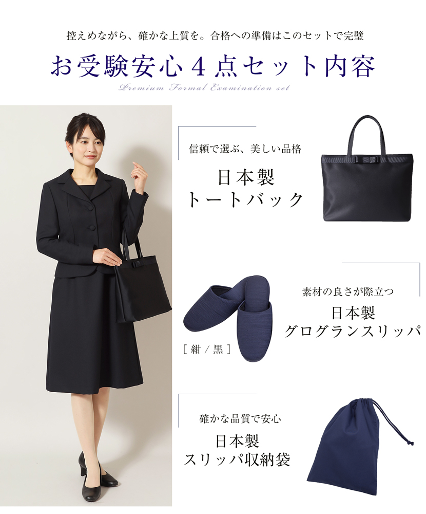 【10%OFF】お受験安心4点セット お受験スーツ 濃紺スーツプレミアムフォーマルセット濃紺アンサンブル+日本製トートバッグ+日本製スリッパ+日本製スリッパ収納袋の豪華4点セット PFKVA-8702[nv]