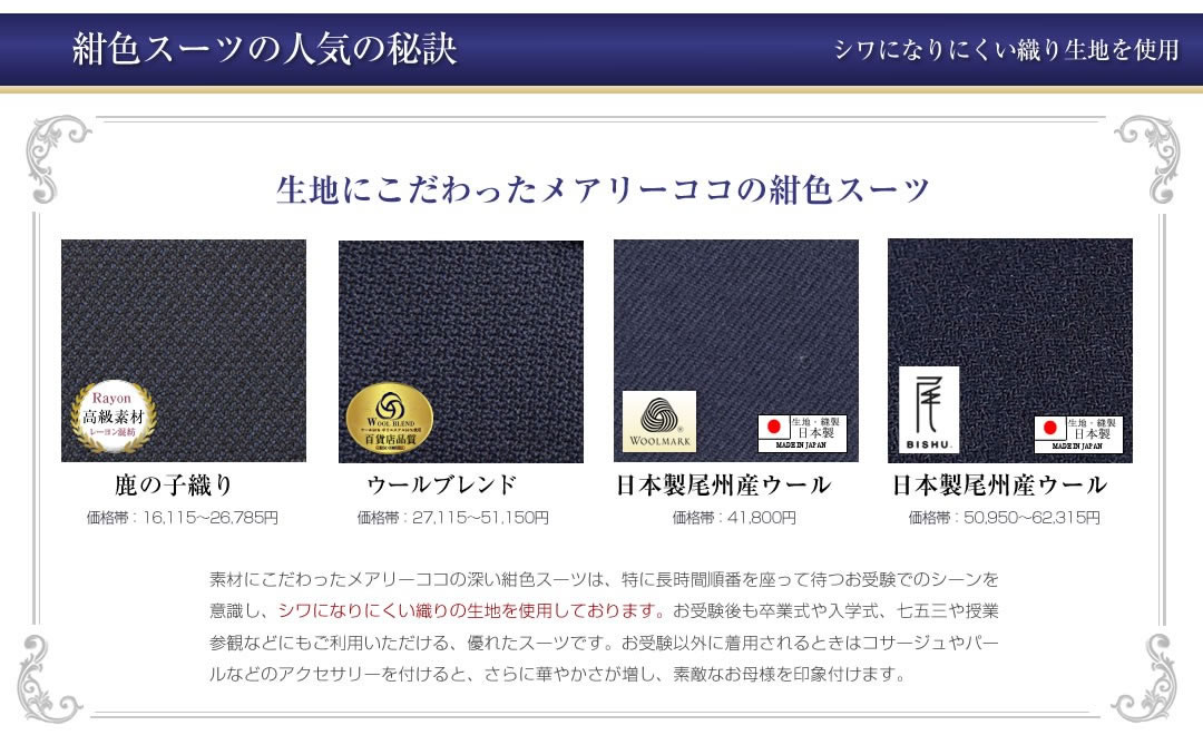 お受験人気No.1シリーズ・濃紺カラースーツは、長時間座っていてもシワになりにくい織りの生地を使用。